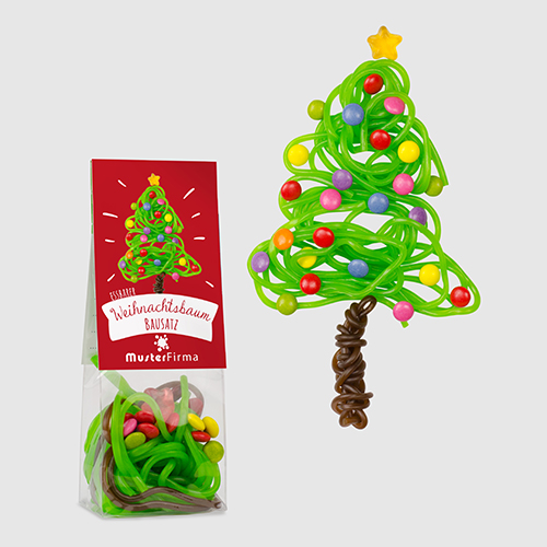 Alle benötigten Zutaten im Tütchen mit individueller Headerkarte: Im Handumdrehen bauen Sie hier einen leckeren Weihnachtsbaum, der dann genüsslich genascht werden darf!