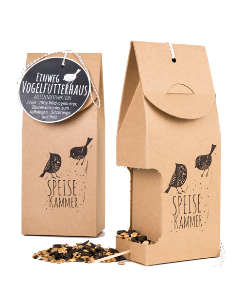 Da freuen sich Natur und Piepmatz: Designer Vogelfutterhaus mit Spenderfunktion aus ökologischem Karton, aus nachhaltiger Forstwirtschaft, beschichtet, um dem ein oder anderen Regenschauer zu trotzen, inkl. 200g Wildvogelfutter, Sitzstange und Baumwollband zum Aufhängen. Mit Ihrem Logo ein toller (Blick)fang!